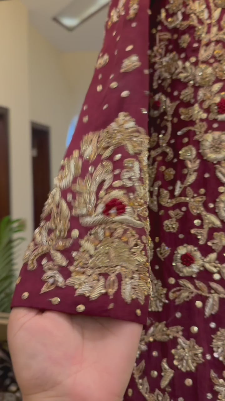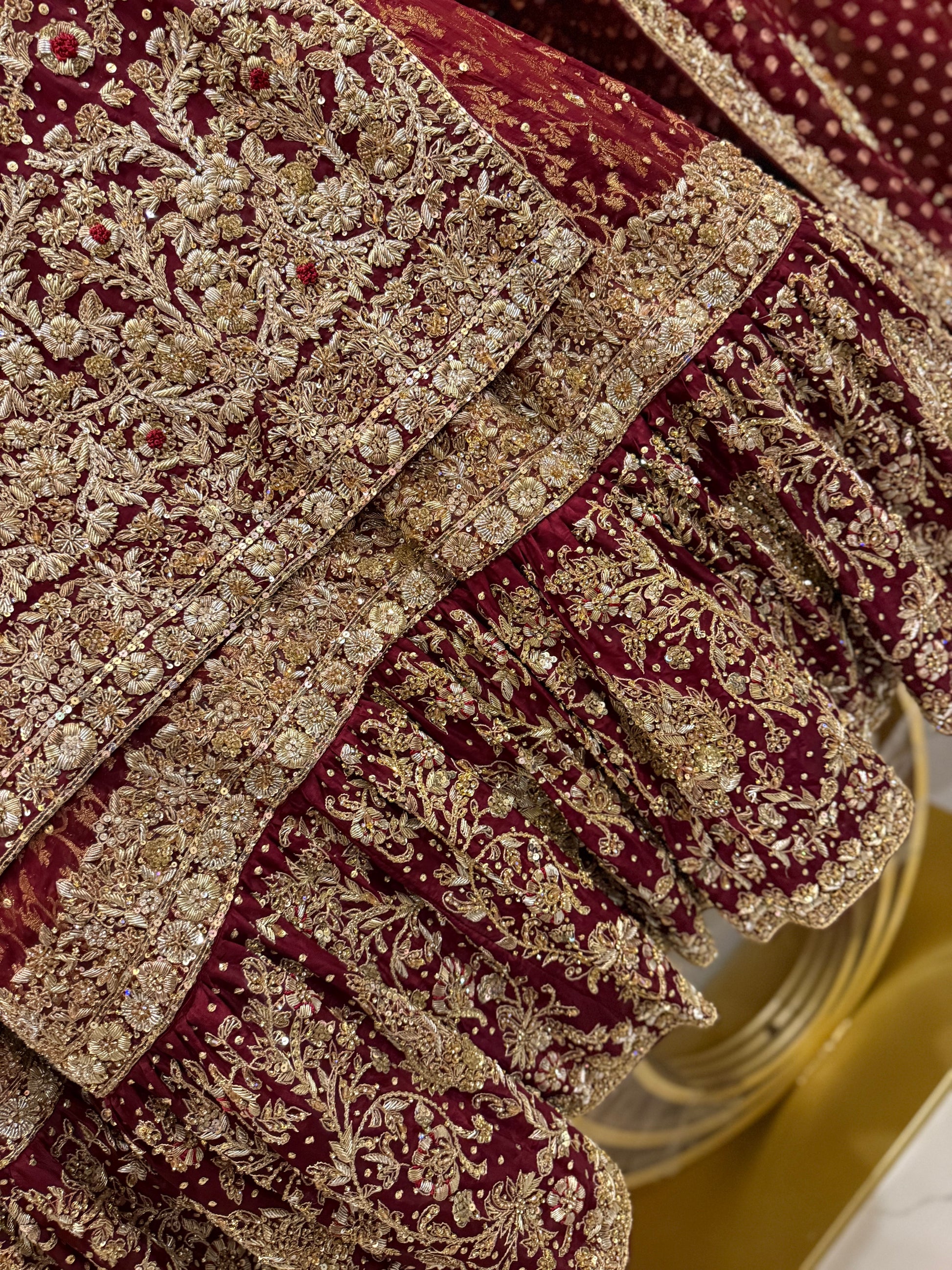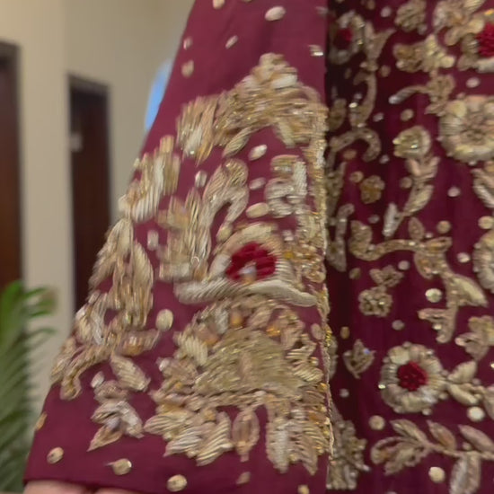 Step into timeless elegance with this luxurious bridal lehenga set, crafted from Tassel silk and jamawar fabrics. The deep maroon ensemble is richly adorned with intricate antique gold zari and sequin embroidery, exuding royal charm. It features a heavily embellished long shirt, a flared brocade lehenga, and a matching dupatta with ornate borders. Perfect for brides seeking a regal and traditional look for their wedding day or special occasions