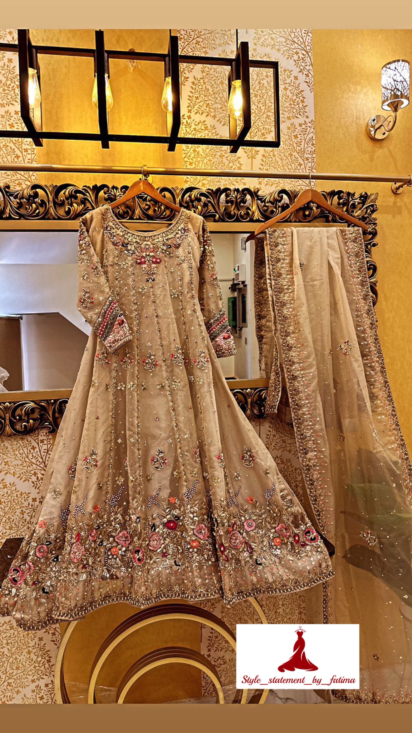 Drape yourself in luxury with this champagne gold Anarkali 3-piece suit, exquisitely crafted for weddings and grand festive occasions. The flared long frock is adorned with intricate embroidery featuring sequins, pearls, resham threadwork, and delicate floral patterns in hues of pink, red, and silver. The sleeves and hemline showcase detailed embellishments, enhancing its regal charm. Paired with a matching dupatta embellished with scattered sequins and an embroidered border, this ensemble radiates timeless sophistication and grace.
