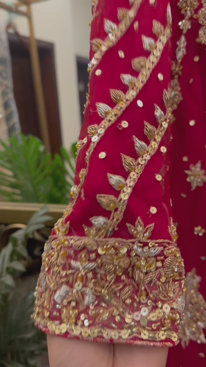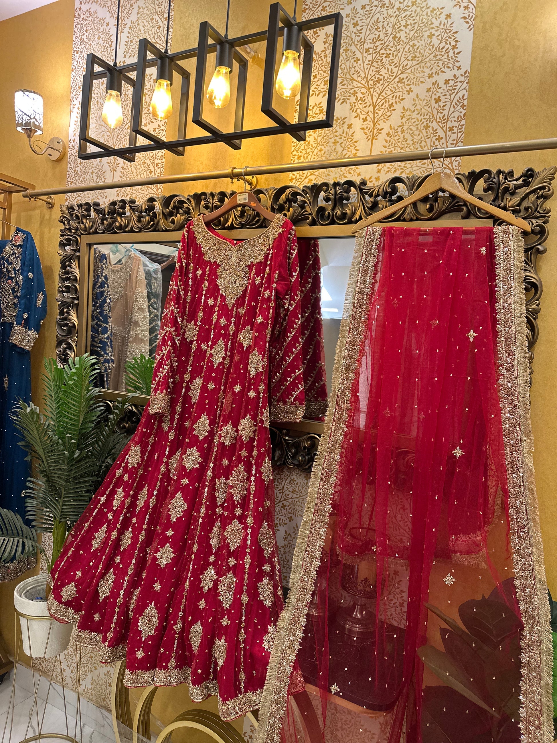 Radiate timeless elegance in this stunning crimson red Anarkali bridal dress, crafted from premium chiffon and adorned with intricate golden zari and sequin embroidery. The flared silhouette exudes royal charm, while the heavily embellished neckline and borders add a luxurious touch. Paired with a matching net dupatta featuring delicate handwork and ornate edging, this ensemble is perfect for weddings and festive occasions.